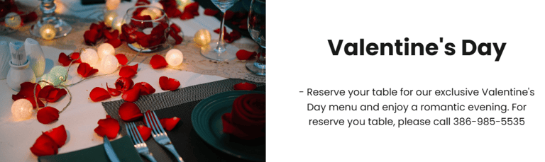 ❤️ Open on Valentine's Day 5pm-9pm! Dine with us on Valentine's Day! Reservations please! (386) 985-5535 ❤️